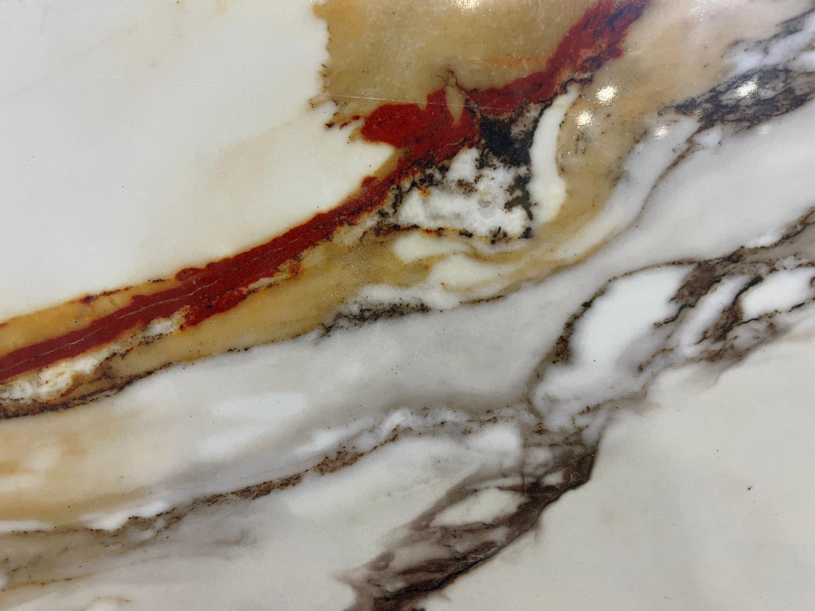Calacatta Tashkent is a bold and dramatic printed quartz surface, featuring a striking canvas of ivory white enriched with deep rust, golden, and charcoal veining. The dynamic interplay of warm and cool tones creates a luxurious masterpiece reminiscent of rare natural marble. Perfect for statement countertops, feature walls, or grand interiors, Tashkent combines modern durability with timeless artistry, making it an ideal choice for designers seeking impact and sophistication.